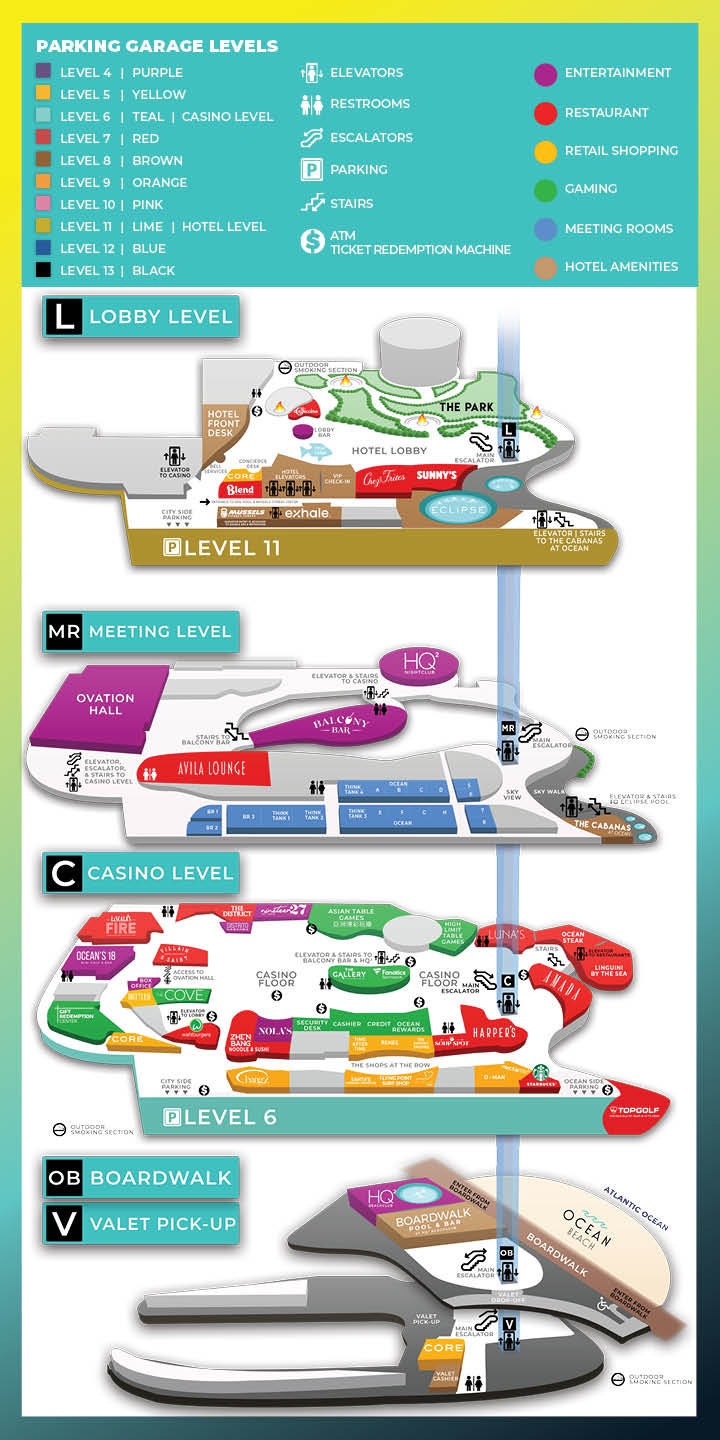Outdoor Meeting + Event Space 90,000 sq. ft Elevate your next event or meeting to inspiring new levels with our spectacular outdoor event spaces. Ocean Casino Resort boasts 90,000 square feet of unique outdoor spaces—complete with Adirondack chairs and fire pits around property—set against a panoramic backdrop of the Atlantic Ocean. Go